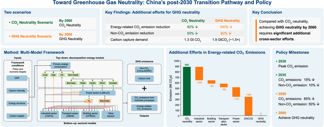 China has set an ambitious target to achieve carbon neutrality by 2060, and promised the economy-wide net greenhouse gas (GHG) emissions reduction in its 2035 Enhanced National Determined Contribution (NDC). However, transitioning from carbon dioxide (CO₂) neutrality to comprehensive GHG neutrality demands significantly more cross-sectoral mitigation efforts. A new multi-model integrated framework has revealed that while CO₂ emissions are expected to peak before 2030, energy-related CO₂ emissions must be reduced to zero by 2060, while non-CO₂ emissions must decrease by 60%. This shift requires the expansion of carbon capture technologies, including direct air carbon capture and storage (DACCS), and substantial improvements in energy efficiency and renewable energy adoption.